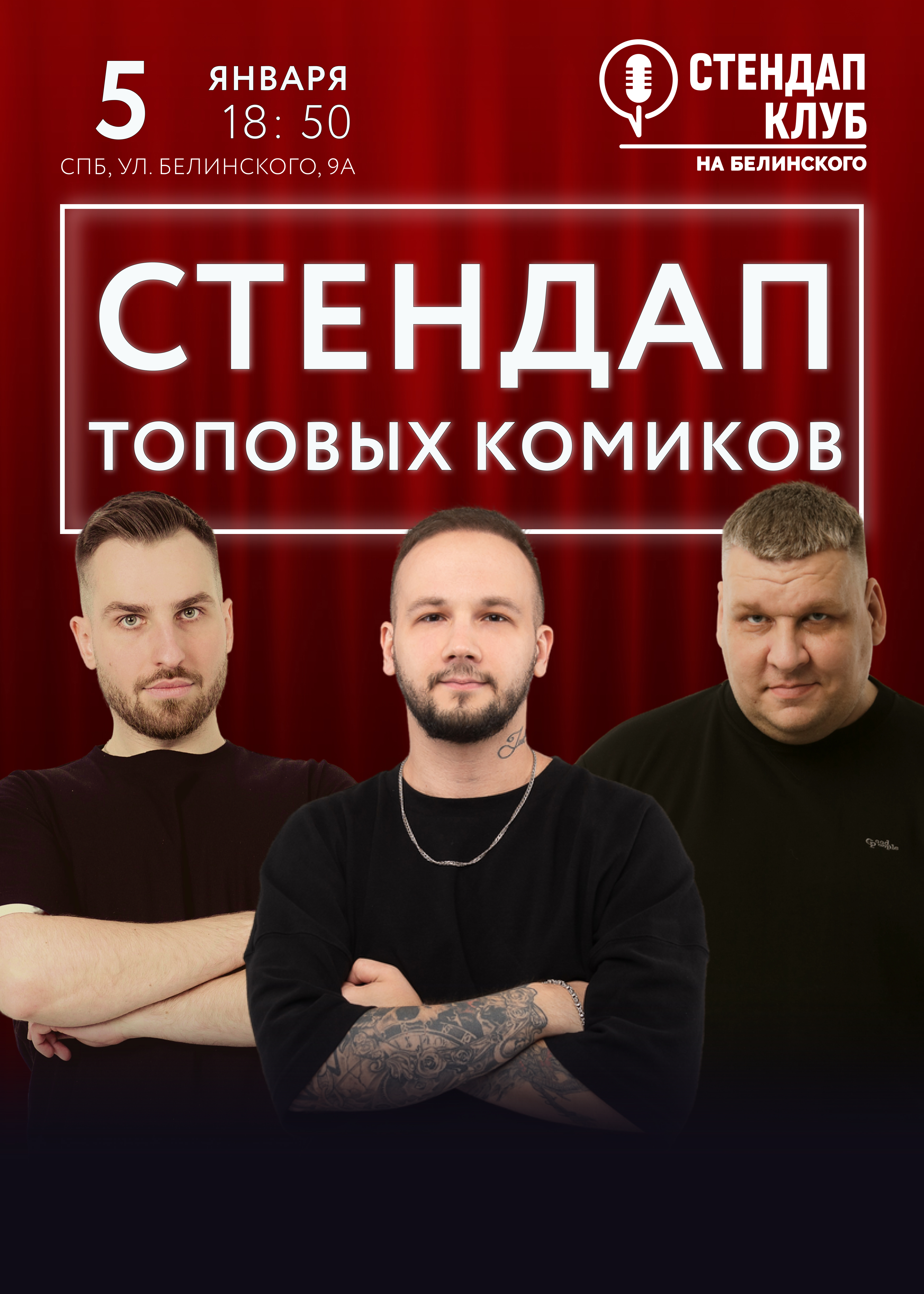 Комики с ТНТ, СТС, Labelcom выступят «без цензуры» со своими лучшими и свежими шутками. В составе только лучшие из ТОП 10 комиков Питера. Вы погрузитесь в атмосферу настоящей, живой стендап комедии от самых опытных комиков Санкт-Петербурга и Москвы, с большим бэкграундом и эфирами на телепроектах ТНТ, СТС и Ютуб! Так же на мероприятии будет призовой розыгрыш для участников.