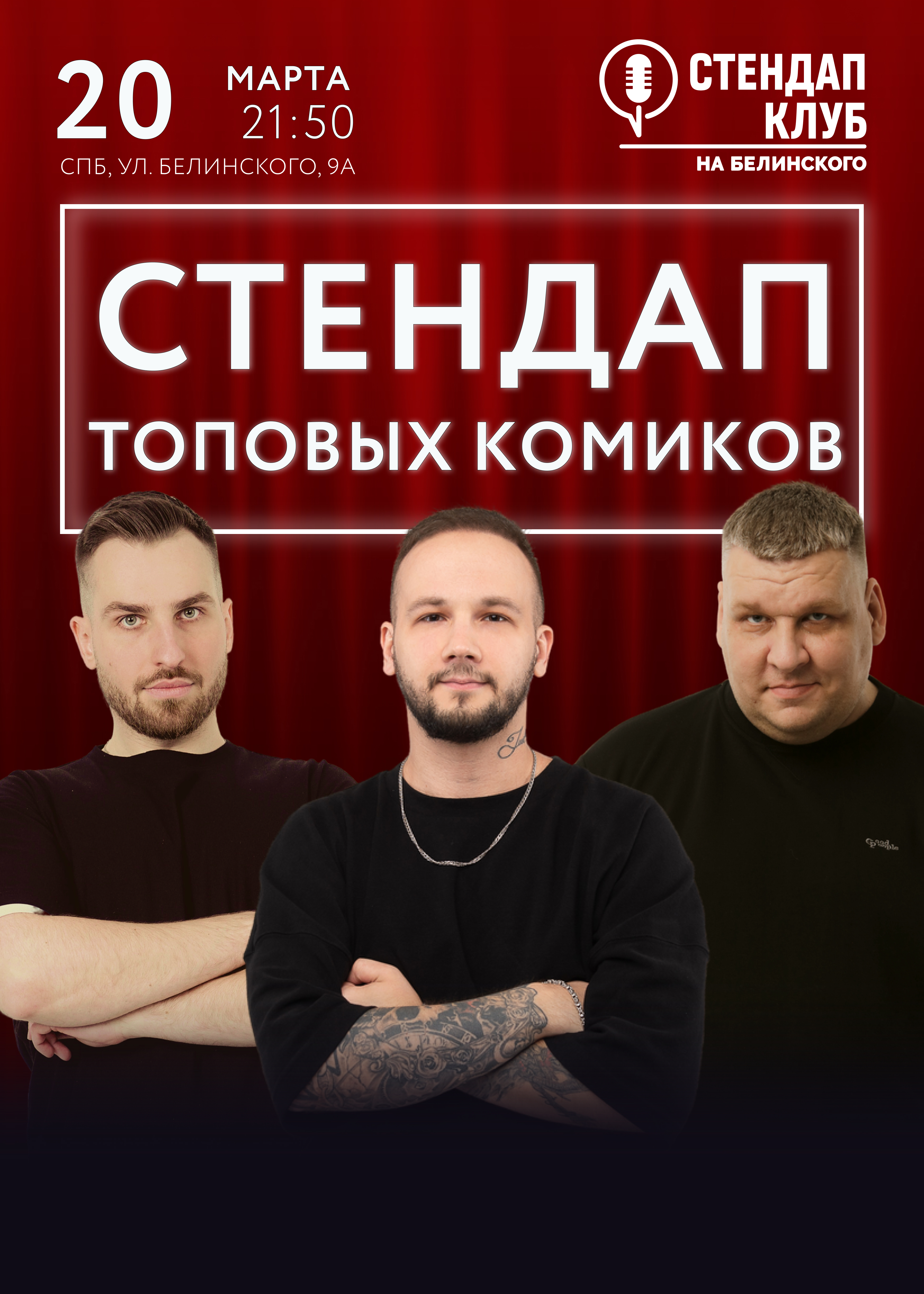 Комики с ТНТ, СТС, Labelcom выступят «без цензуры» со своими лучшими и свежими шутками. В составе только лучшие из ТОП 10 комиков Питера. Вы погрузитесь в атмосферу настоящей, живой стендап комедии от самых опытных комиков Санкт-Петербурга и Москвы, с большим бэкграундом и эфирами на телепроектах ТНТ, СТС и Ютуб! Так же на мероприятии будет призовой розыгрыш для участников.