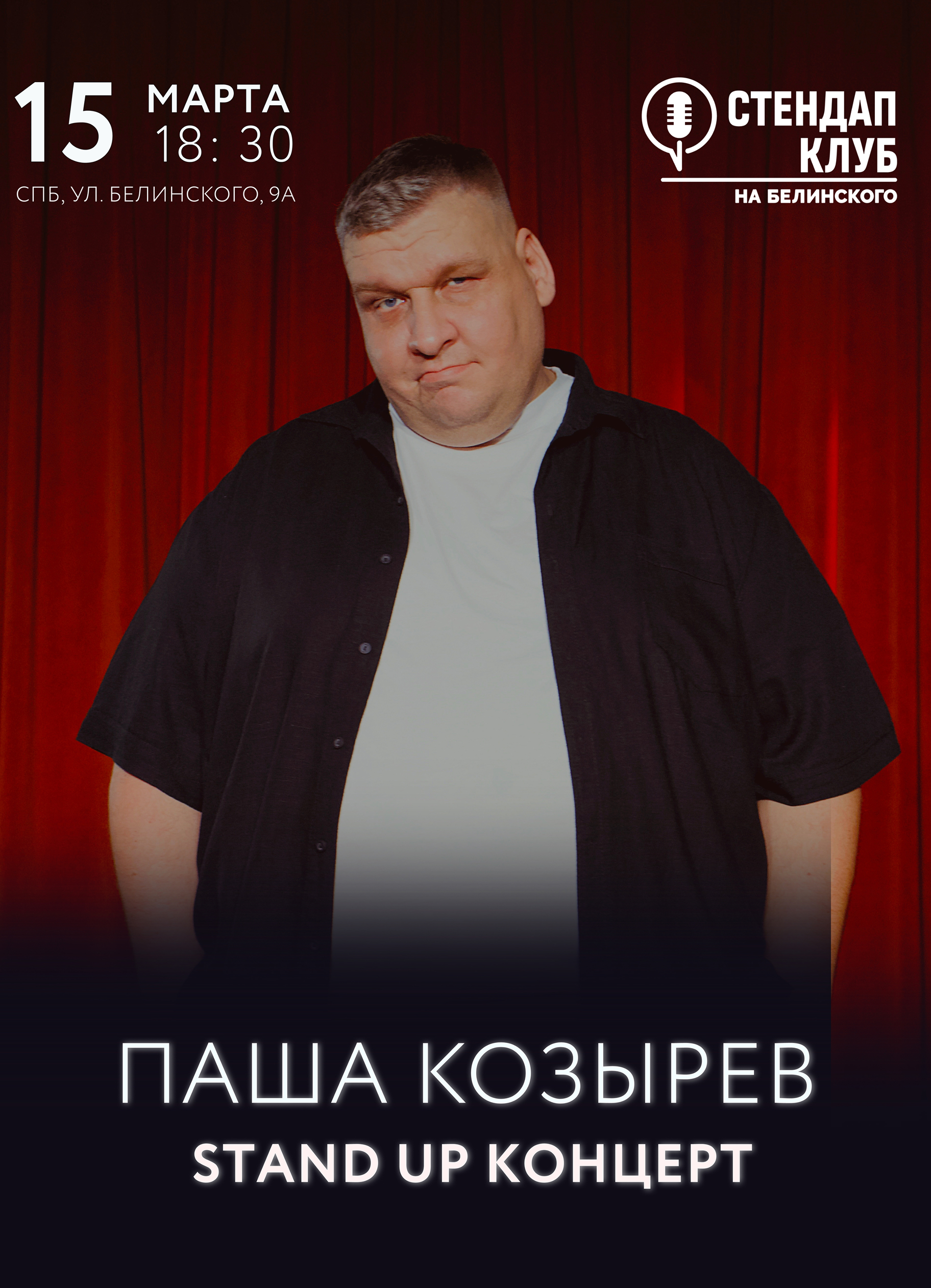 Паша Козырев — популярный комик, с более чем 20 млн просмотров на youtube, участник ТВ проекта «Взрослые люди». Весь концерт Паши, это собственный жизненный опыт, через призму стендап комедии. Ему 35 лет, а значит этого опыта много. Паша — это self made комик с большой и постоянно растущей аудиторией в соцсетях.