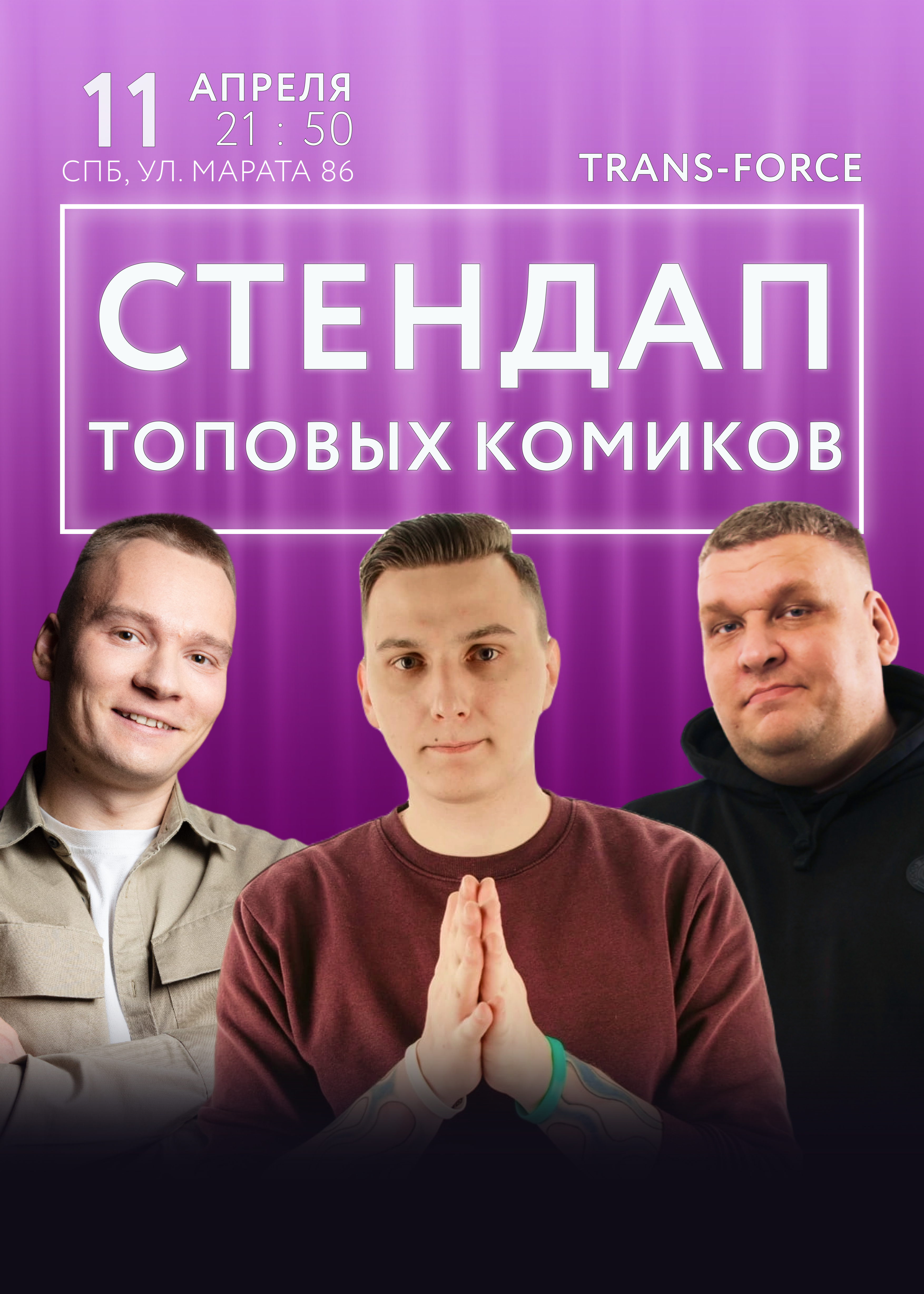 Комики с ТНТ, СТС, Labelcom выступят «без цензуры» со своими лучшими и свежими шутками. В составе только лучшие из ТОП 10 комиков Питера. Вы погрузитесь в атмосферу настоящей, живой стендап комедии от самых опытных комиков Санкт-Петербурга и Москвы, с большим бэкграундом и эфирами на телепроектах ТНТ, СТС и Ютуб! Так же на мероприятии будет призовой розыгрыш для участников.